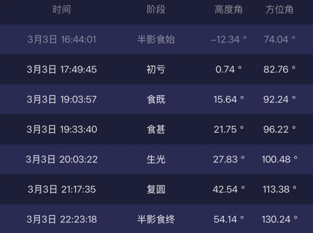 3.观赏很简单:此次月全食全程4小时多,算上半影月食近6小时,16:42半影食始,22:24半影食终,其中17:49-21:17的初亏至复圆是目视精彩阶段,19:04-20:03全食阶段的“红月亮”为核心看点,19:33食甚时刻,月球最深入本影区,红月亮效果最壮观,肉眼即可观测。