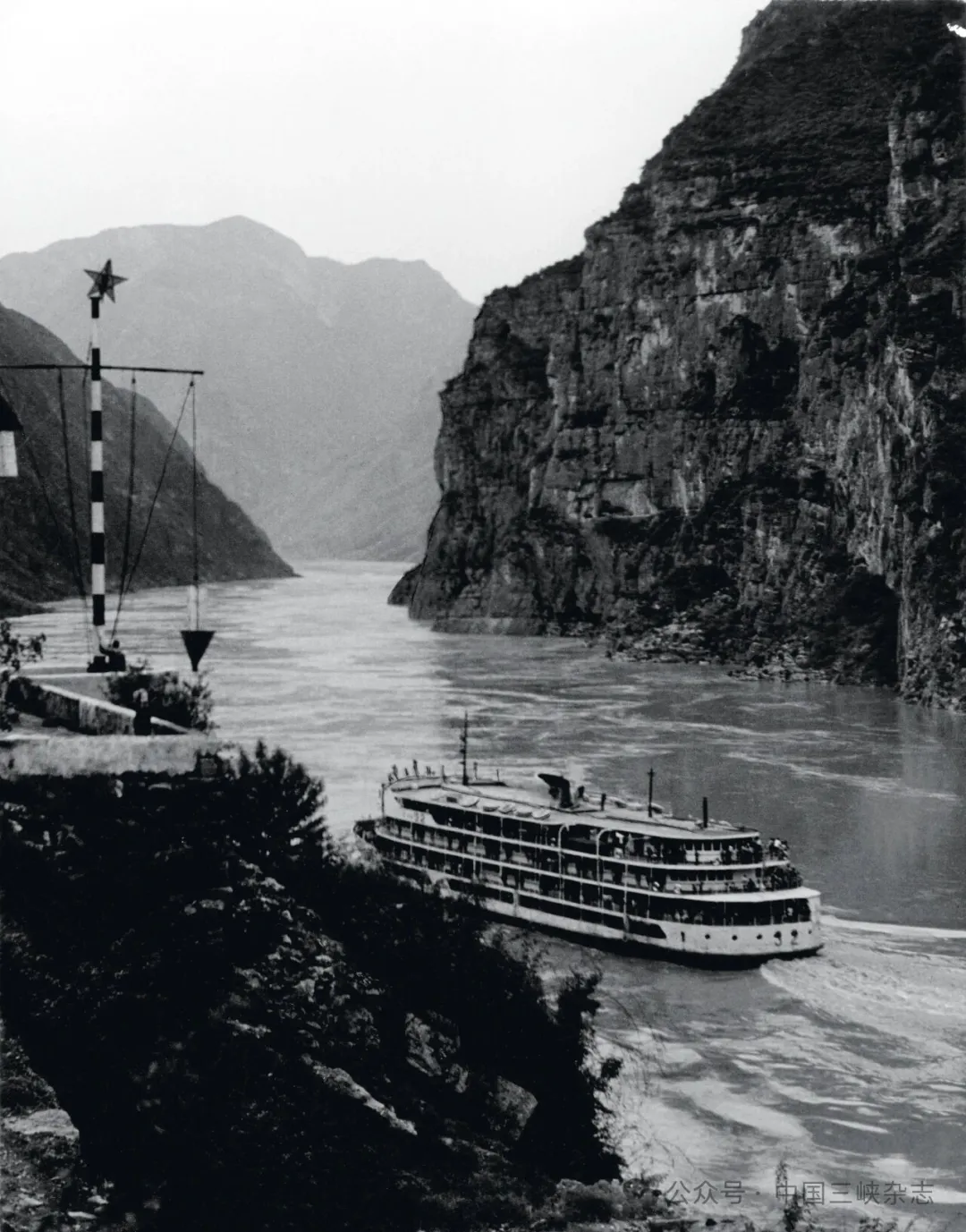 三峡中的信号台。川江信号台是是川江上特有的助航设施,起源于古代举旗击鼓的导航办法。1915年,英国人蒲兰田在万县孤摊设立了第一座现代信号台,此后信号台逐渐增多并不断升级设备,20世纪后,随着三峡蓄水工程与航道改善,大部分信号台被拆除,目前仅余20多座信号台伫立两岸。图片来源 | 长江重庆航道局宣传处