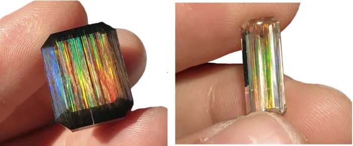 托帕石内部的孔隙大多为管状空腔,当这些管状空腔近似平行排列,空腔之间的间隙接近可见光的波长(390~760纳米)时,光线射入晶体内部,遇到这些近似规律排列的管状空腔,就会发生特殊的光学效应,激发出彩虹般的色彩。