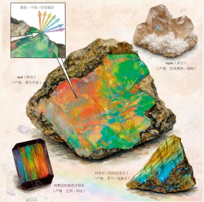 假色现象中的晕彩效应,是指入射光线遇到薄膜发生干涉或衍射作用,致使某些特定波长的光波减弱或消失、某些光波得以加强,最终表现出多种色彩的现象。矿物内发生的干涉和衍射密切相关的,它们经常同时发生。生活中由光的干涉引起的现象有很多,比如彩虹就是当阳光穿过水滴时,光线发生折射和反射现象而形成的七彩光谱;水中或肥皂泡的油层虹彩效果也属类似情况。某些宝石晶体内部分布有极薄的裂隙面,光线通过裂隙面同样会产生干涉作用,使裂隙表面呈现七彩光芒。这种现象经常出现在水晶或者玛瑙之中。光的衍射现象在日常生活中也有实例,在太阳或灯光周围出现的光圈叫作星芒,其原理就是光的衍射。在宝石学中,宝石内部的衍射效应同样能呈现出色彩斑斓的衍射条纹,比如澳宝之王——欧泊。