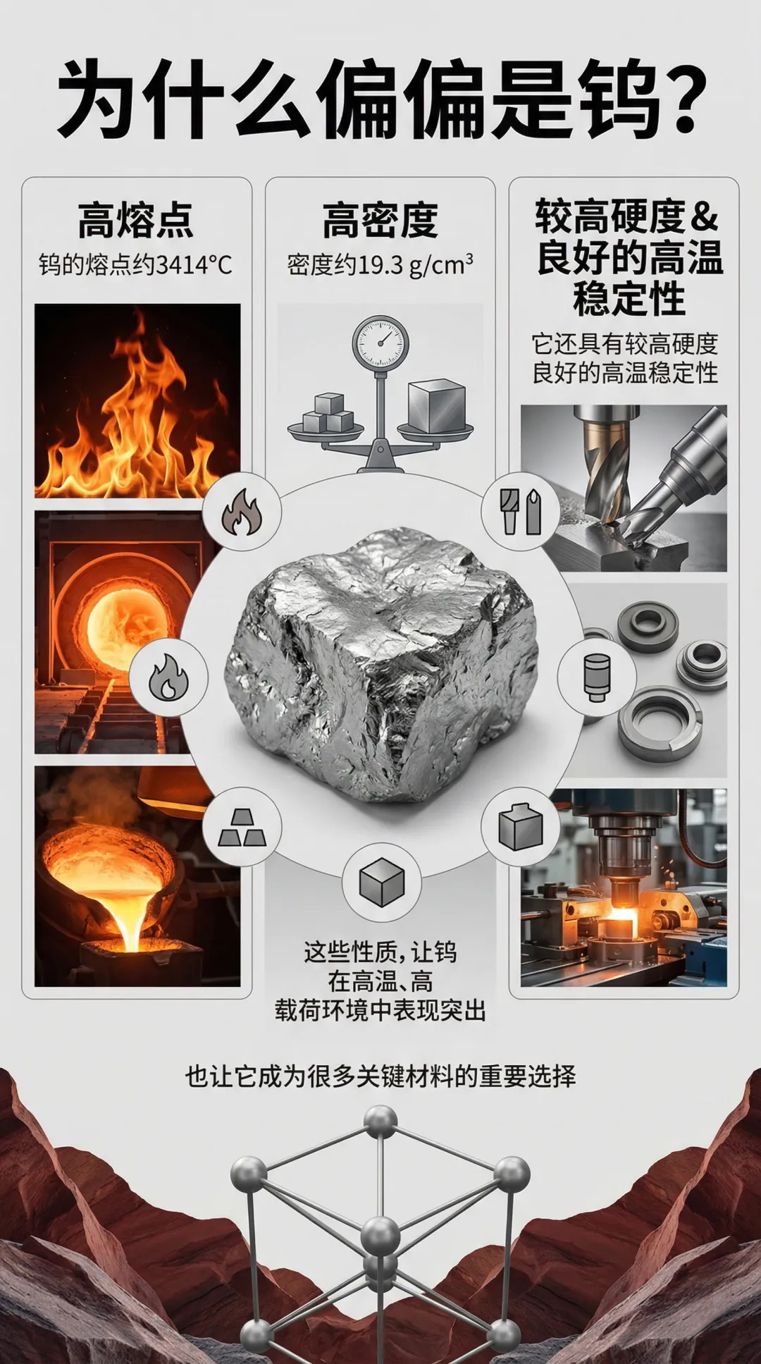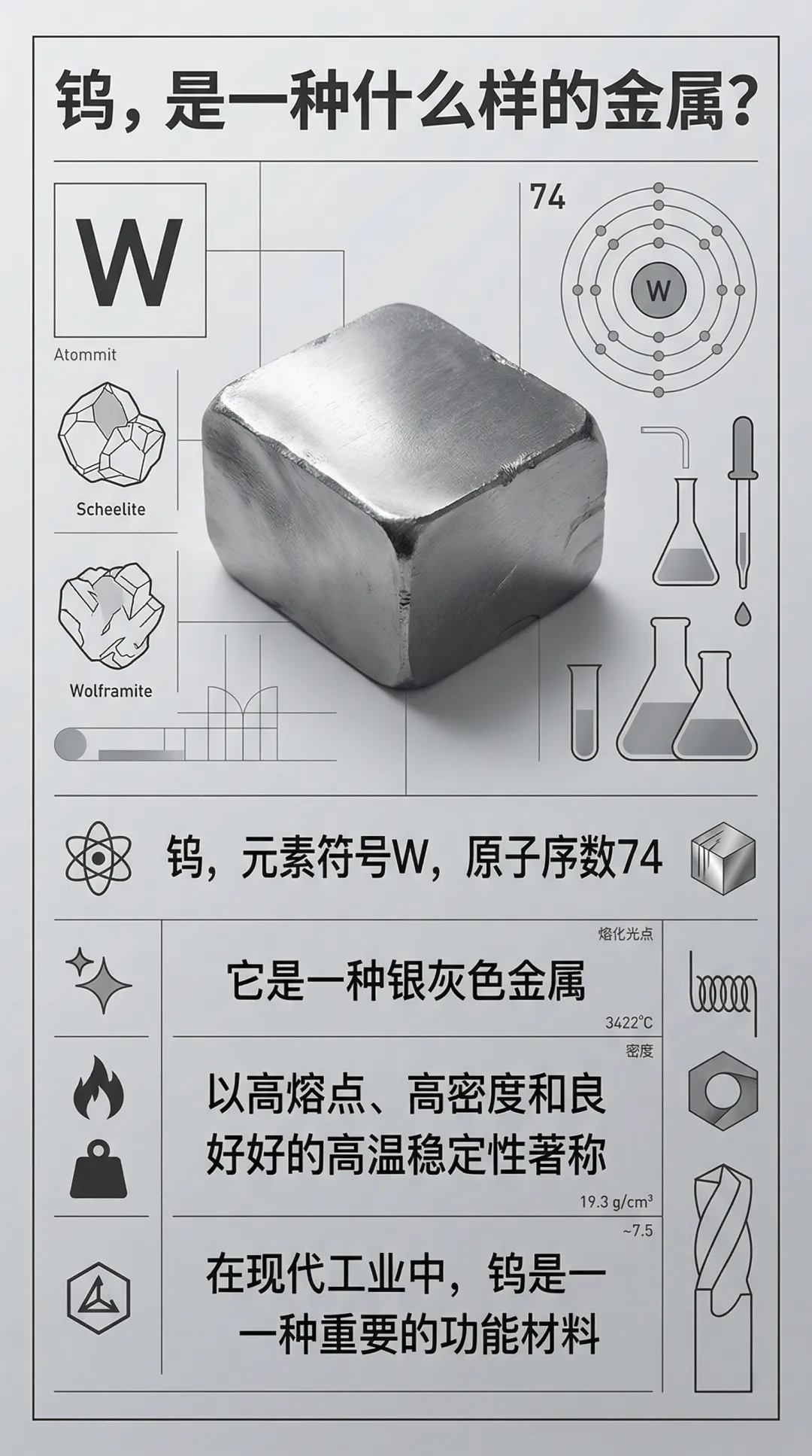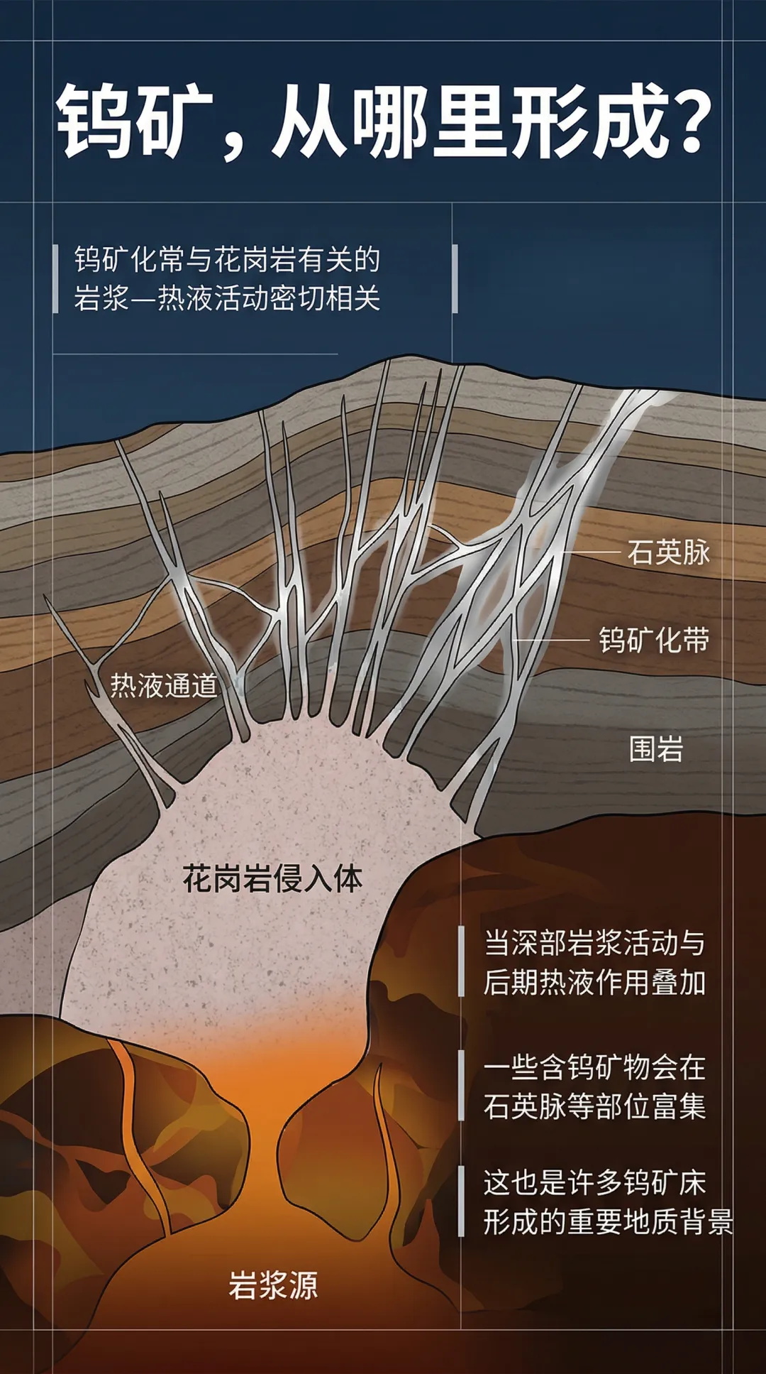 今天的这组信息图由地质队员结合专业知识整理制作。我们想把钨背后的链条讲清楚:它是什么,它为什么会形成在岩石和矿脉之中,今天的地质队员怎样现代化勘探手段去认识地下、利用资源。