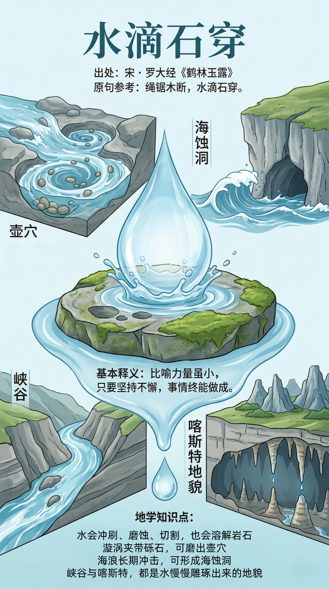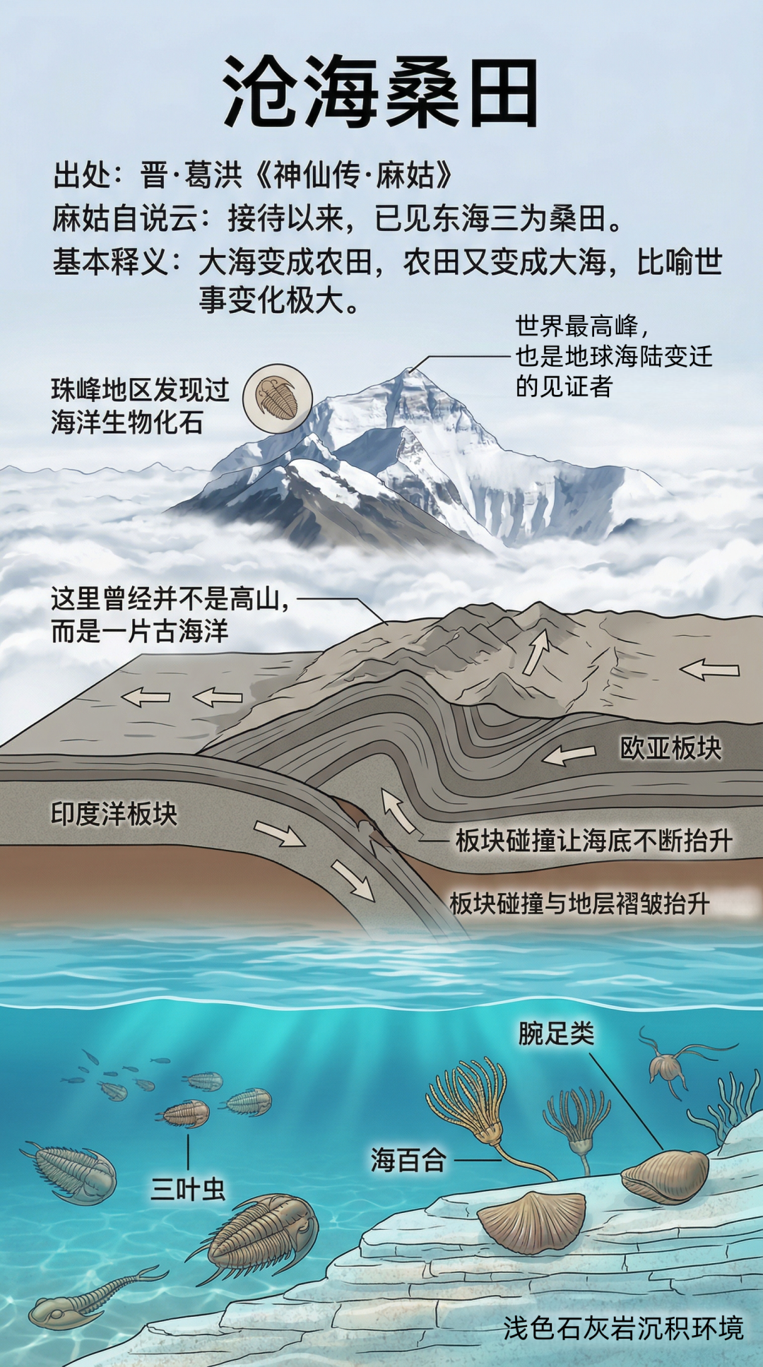 地质科学研究的是地球的历史,而中华文化同样在漫长岁月中沉淀生长。当地质的时间尺度与成语的文化意蕴相遇,那些原本熟悉的词语,便有了新的打开方式。无论是“沧海桑田”的地壳变迁,还是“水滴石穿”的地貌雕琢,文化的意象与科学的事实,常常在不经意间彼此印证,也让我们对脚下这颗星球多了一分亲近的理解。
