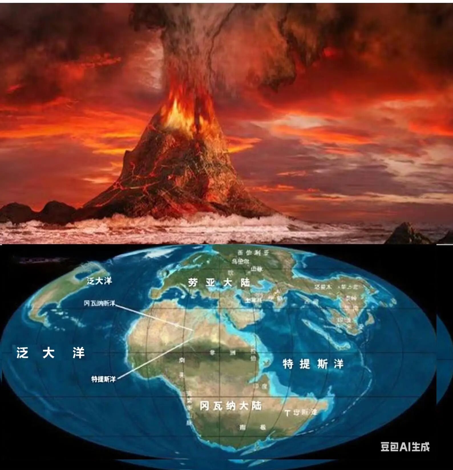第五次生物大灭绝事件发生在大约2.01亿年前,也称三叠纪末期生物大灭绝事件, 第五次生物大灭绝事件想象图,以及当时的地球面貌 三叠纪末期,地球上的陆地还是一个整体,称盘古大陆(联合古陆)。