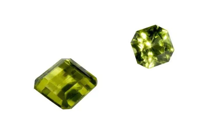 肉眼鉴别时,我们可以观察橄榄石的颜色,其原石颜色通常为黄绿色,晶面上常有纵纹。放大观察时,可见晶体内部的包裹体或由裂隙所产生的“睡莲叶”状包裹体。当橄榄石被琢磨成小面型宝石时,通过大的台面可见刻面棱双影线或内含物呈双影。