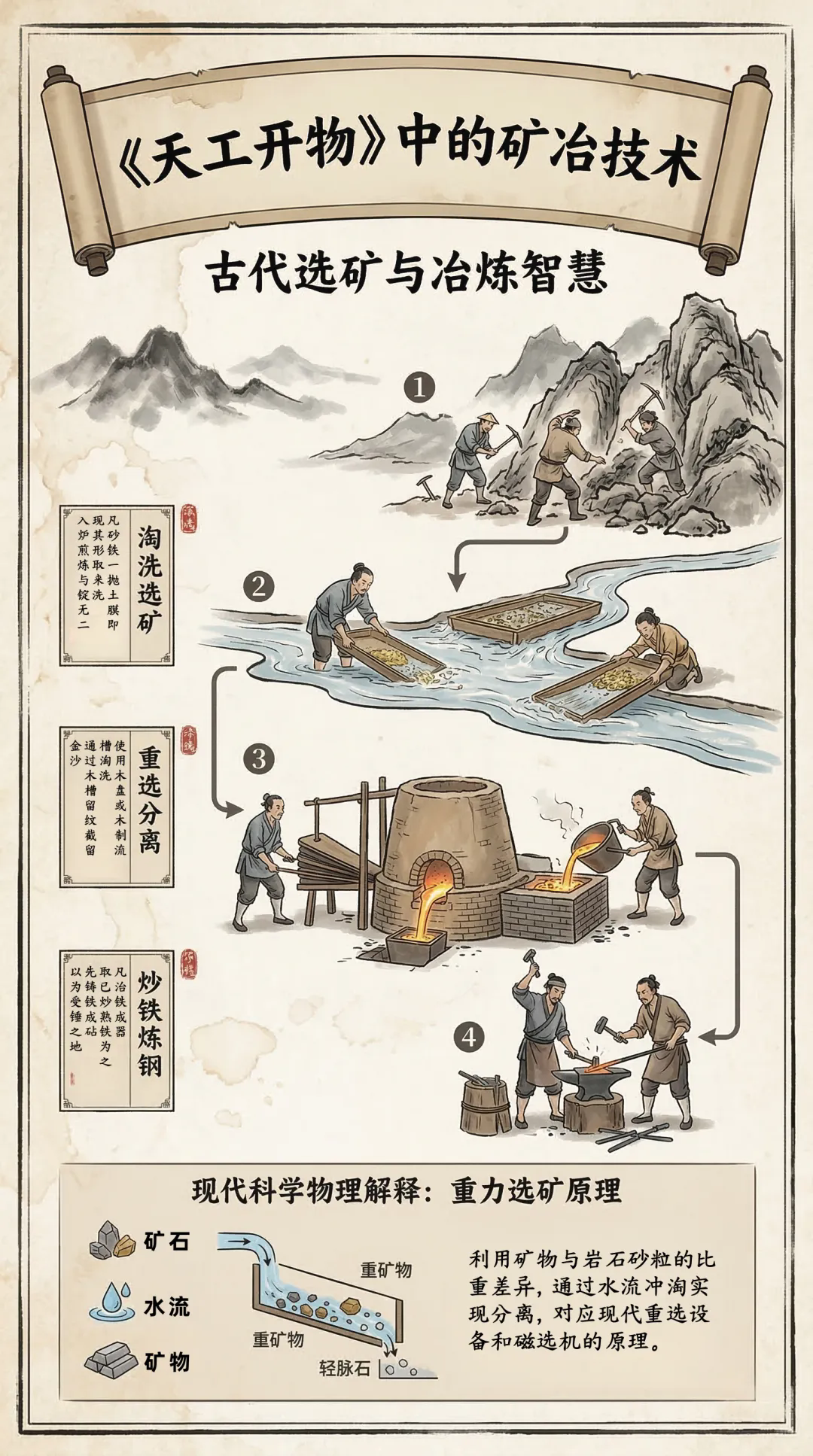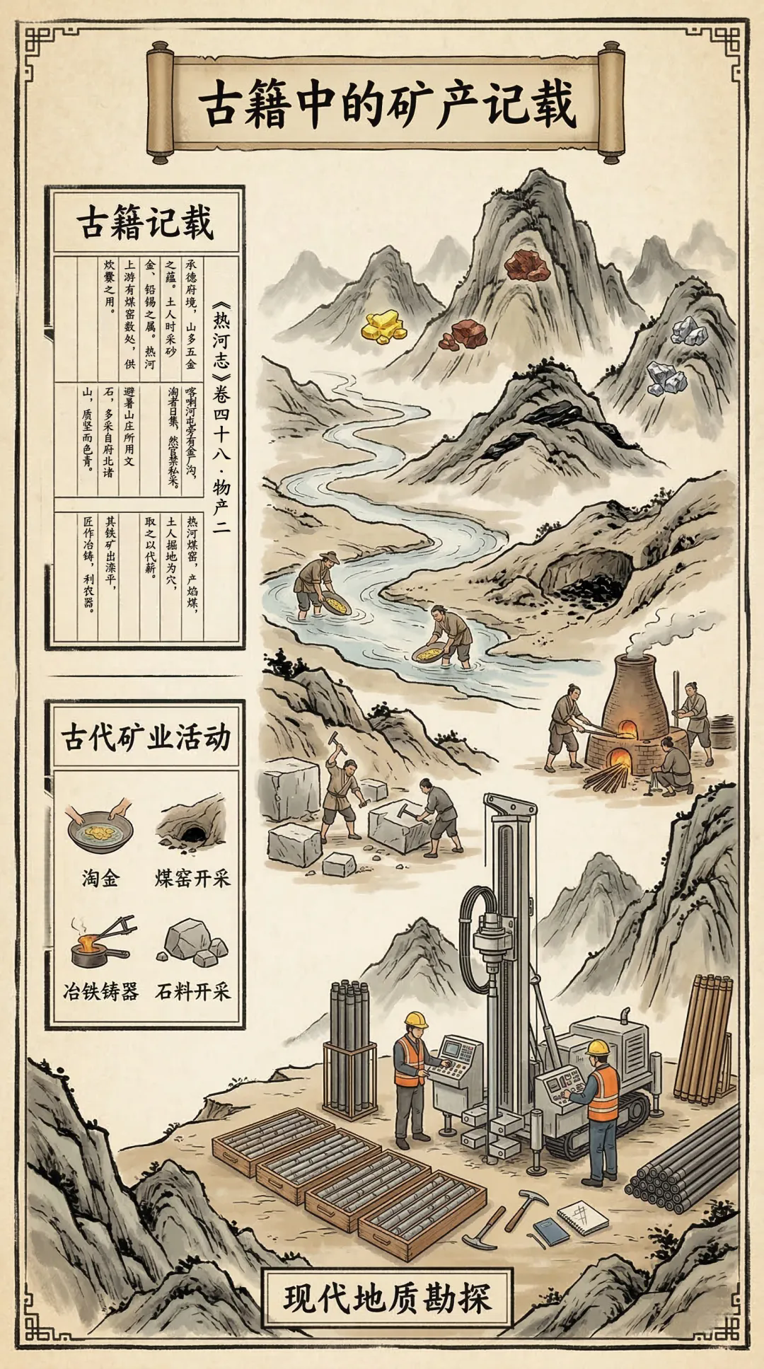 在很多人的印象里,找矿似乎是现代地质科学的专利。但如果翻开中国古代典籍,就会发现,早在两千多年前,人们就已经开始通过山石颜色、矿物迹象和地表特征来判断地下矿藏。《管子·地数篇》提出“上有丹砂,下有黄金”,总结出朴素而深刻的找矿经验;《热河志》记录了燕山一带砂金、煤窑与铁矿的开采景象;《天工开物》则以生动笔触描绘了古人采矿、选矿与冶炼的技术智慧。