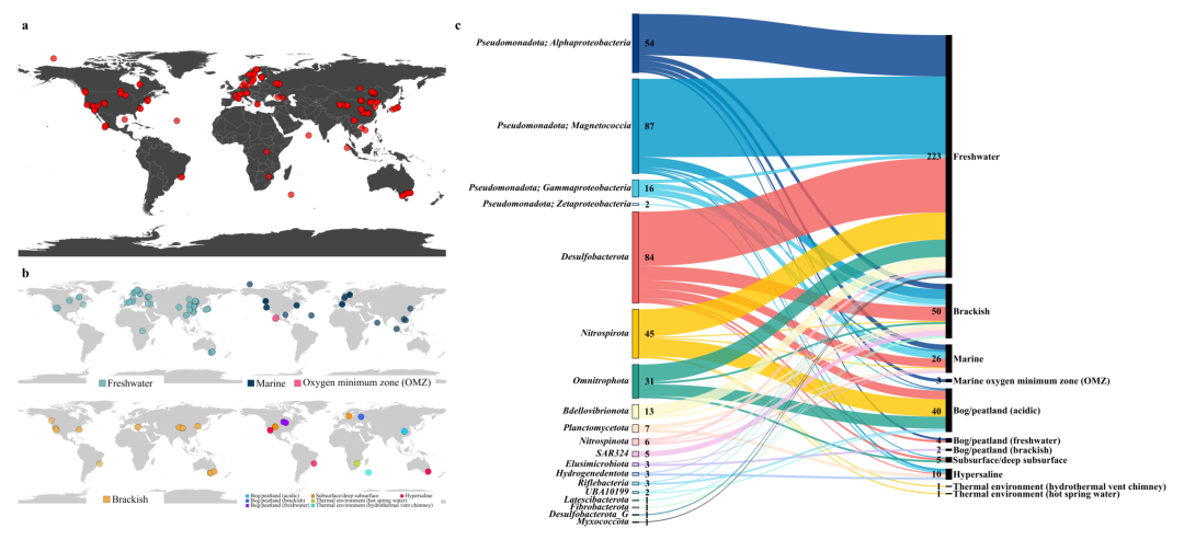 GdbMTB 由核心数据、元数据和技术支持三部分构成,系统整合来自不同公共数据库和科学出版物的多源信息(图 1),建立迄今最全面的趋磁细菌基因组资源平台。核心数据涵盖2024年6月前所有已公开报道的趋磁细菌基因组及其关键特征信息。数据显示,趋磁细菌基因组分布于16个细菌门、35个纲和49个目(图2)。样品来源于全球六大洲、四大洋,涵盖淡水、咸水、海洋、极端环境等多种生境(图3)。元数据部分细分为采样元数据、基因组元数据和参考文献元数据,关联了样品来源、环境背景、序列提交信息与原始文献等内容,确保数据来源可追溯。技术支持提供趋磁细菌相关的生物信息学工具(如自主开发的磁小体基因簇注释与可视化工具MagCluster和ANI分析结果可视化工具pairwiseANIviz)和分析流程,共同构成了 GdbMTB 的技术支撑体系,使数据库不仅提供数据资源,也为趋磁细菌组学研究提供了分析方法(图4)。