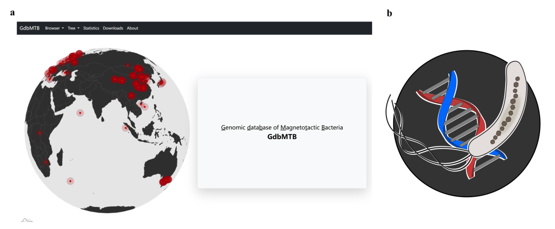针对这一瓶颈,中国科学院地质与地球物理研究所生物地磁学研究团队,对分散的趋磁细菌基因组数据资源进行系统整合与质量评估,并关联了样品的环境信息和文献来源等元数据,构建了国际首个趋磁细菌基因组数据库(GenomicDatabase ofMagnetotacticBacteria, 简称GdbMTB),为趋磁细菌的研究和应用提供了可靠的数据基础。GdbMTB具有交互式、用户友好的界面以及与外部数据库的直接链接,方便用户浏览和查询趋磁细菌基因组数据、追溯原始研究并进行跨数据库导航。