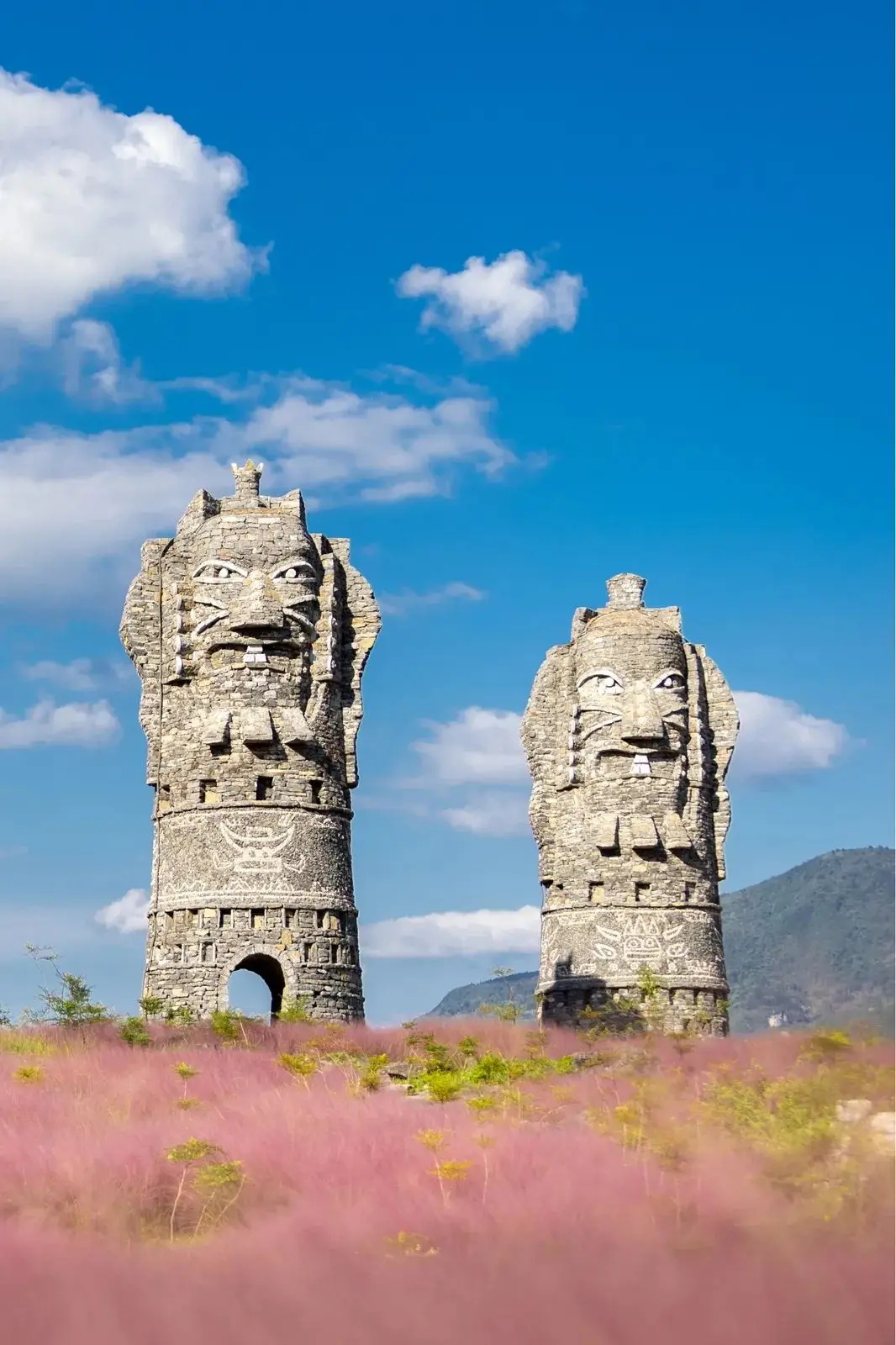 若说秋日的红叶和粉黛乱子草是板溪季节限定的华服,那叠石花谷的叠层石化石,便是它永恒的灵魂。在扎营村叠石花谷中,艺术家以叠层石为原料,结合古老神秘的巫傩文化,打造了十二月神柱石阵、叠石祭坛、二十四戏神雕塑群等十余处特色文化景观,将自然与人文两种古老的遗产圆融一体,让科学价值与文化传承于此奇妙碰撞,而又相得益彰。