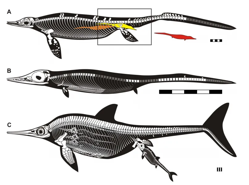 巢湖龙与狭翼鱼龙分娩方式对比。A,分娩的巢湖龙和三只幼体;B,巢湖龙幼体;C,狭翼鱼龙的一只幼体即将离开母体,三只在体腔内。比例尺:5cm。图片来源:10.1371/journal.pone.0088640