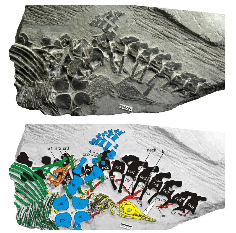 有三个胚胎的巢湖龙母体化石,黑色为母体脊柱,蓝色为母体骨盆和后鳍状肢,绿色为母体的肋骨和腹膜肋。胚胎1和2分别为橙色和黄色,已产出幼体为红色。比例尺:1cm。图片来源:10.1371/journal.pone.0088640