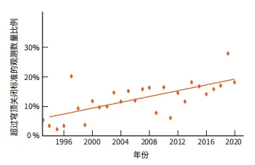在过去的几十年里,山顶的天气超过凯克天文台穹顶关闭标准的夜间观测数量的百分比。结果显示单个条件并不一定发生了显著变化,相反,各种条件的叠加效果正在恶化。