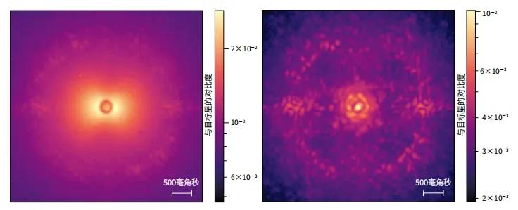 风致光晕,使用甚大望远镜的SPHERE-IRDIS仪器拍摄的两张红外图像显示了风造成的差异:两张图像都是恒星HR4796A的图像,它被一个碎片盘环绕着。在有风致晕的图像(左图,96秒曝光)中,恒星周围看不到这个侧向盘,但在另一张图像(右图,32秒曝光)中可以看到。每个图像边缘周围的较大环是由于自适应光学校正造成的。