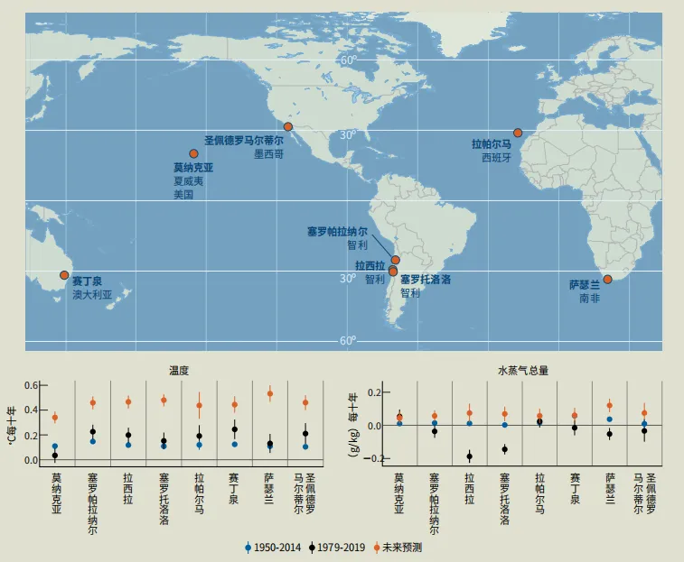 2014年(蓝色点)和1979年至2019年(黑色点)两段时期,研究人员使用高分辨率全球气候模型预测了未来可能发天文学家使用基于历史天气数据的多个模拟来观察八个天文台的温度、水蒸气和其他变量的变化。这些模拟涵盖1950生的事情(橙色点)。在研究的变量中,与真实数据相比,只有温度和空气中的水蒸气总量是可靠的。这些结果表明,在过去几十年中,气温每十年上升约0.1°C,从现在到2050年,每十年将上升0.3°C至0.6°C。大气的水蒸气含量也可能会略有上升。