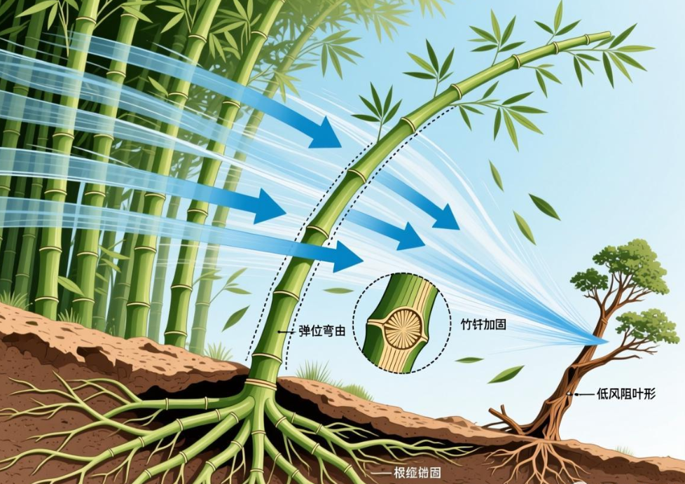 竹子中空有节,结构轻巧且具有极高的韧性。当狂风吹袭时,竹竿弯曲变形,将风的动能转化为自身的弹性势能,避免了硬碰硬导致的折断。这种结构在现代仿生学和建筑抗震设计中都有应用。