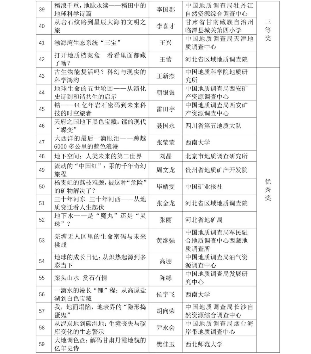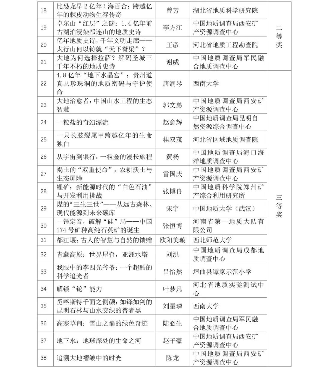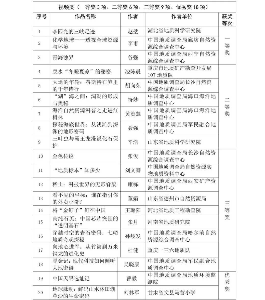 本次大赛共征集到来自210多家单位的各类科普作品1700余件,经过资格审查、初审、终审等流程,最终评出一、二、三等奖作品129个,个人优秀奖和优秀组织奖若干(详情见附件)。现将结果予以公示,公示期自11月3日至7日。公示期间,对公示的作品如有不同意见,请以书面形式,实名向中国地质图书馆(中国地质调查局地学文献中心)与李四光地质科学奖基金会反映。以单位名义反映情况的材料需加盖单位公章,以个人名义反映情况的材料应署实名并提供有效的联系方式。