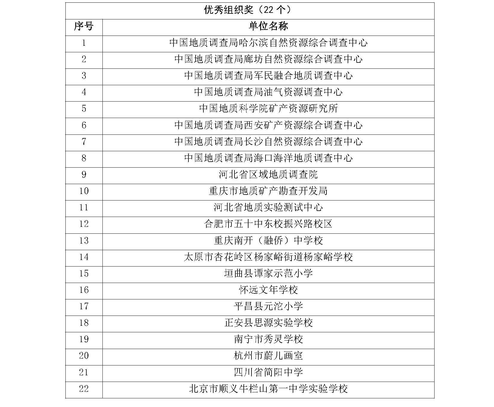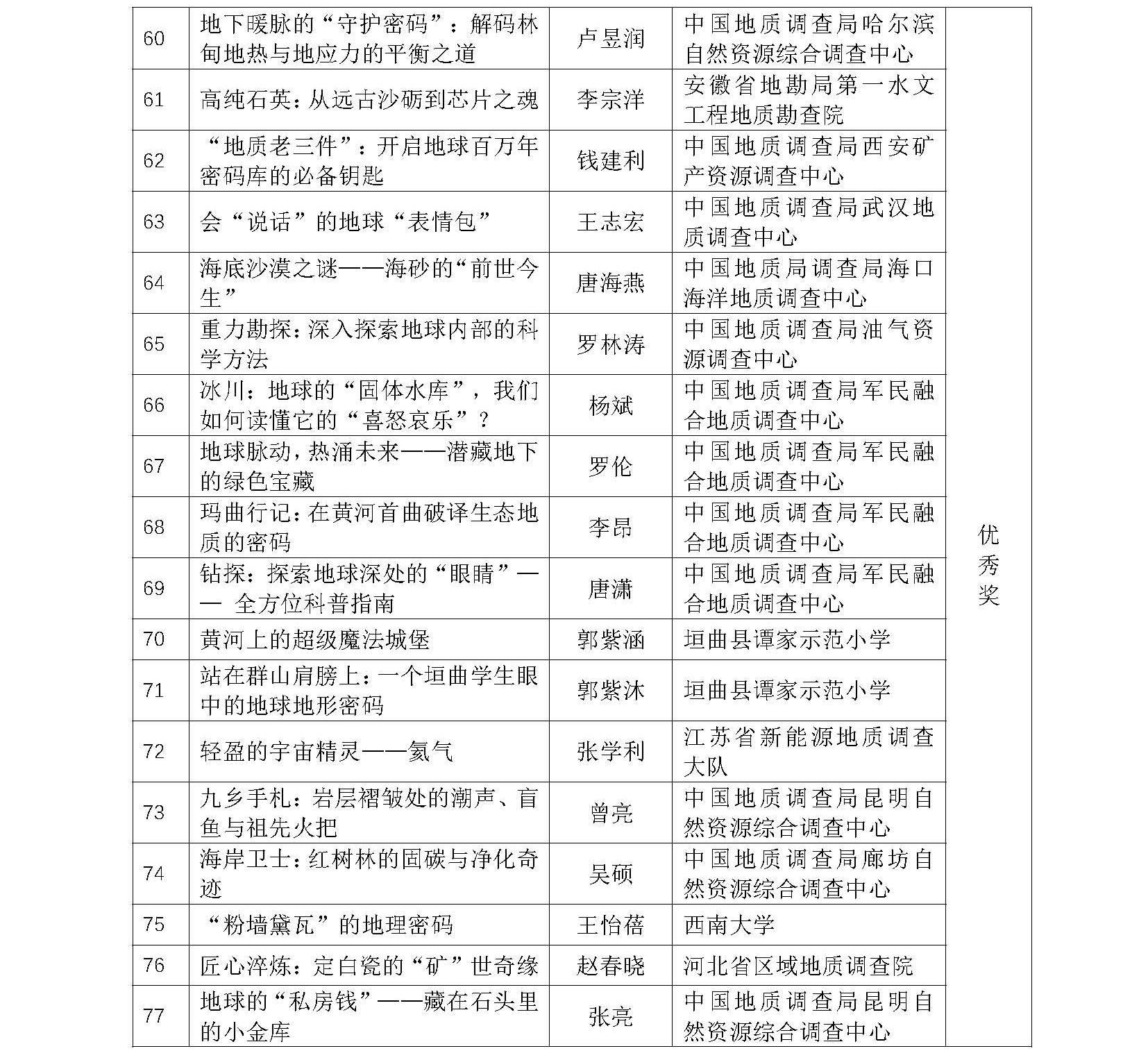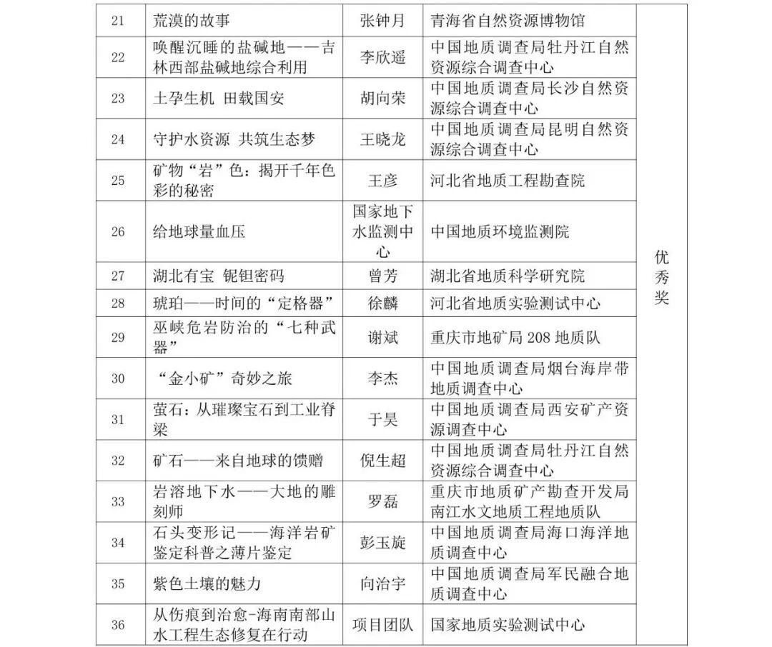 本次大赛共征集到来自210多家单位的各类科普作品1700余件,经过资格审查、初审、终审等流程,最终评出一、二、三等奖作品129个,个人优秀奖和优秀组织奖若干(详情见附件)。现将结果予以公示,公示期自11月3日至7日。公示期间,对公示的作品如有不同意见,请以书面形式,实名向中国地质图书馆(中国地质调查局地学文献中心)与李四光地质科学奖基金会反映。以单位名义反映情况的材料需加盖单位公章,以个人名义反映情况的材料应署实名并提供有效的联系方式。