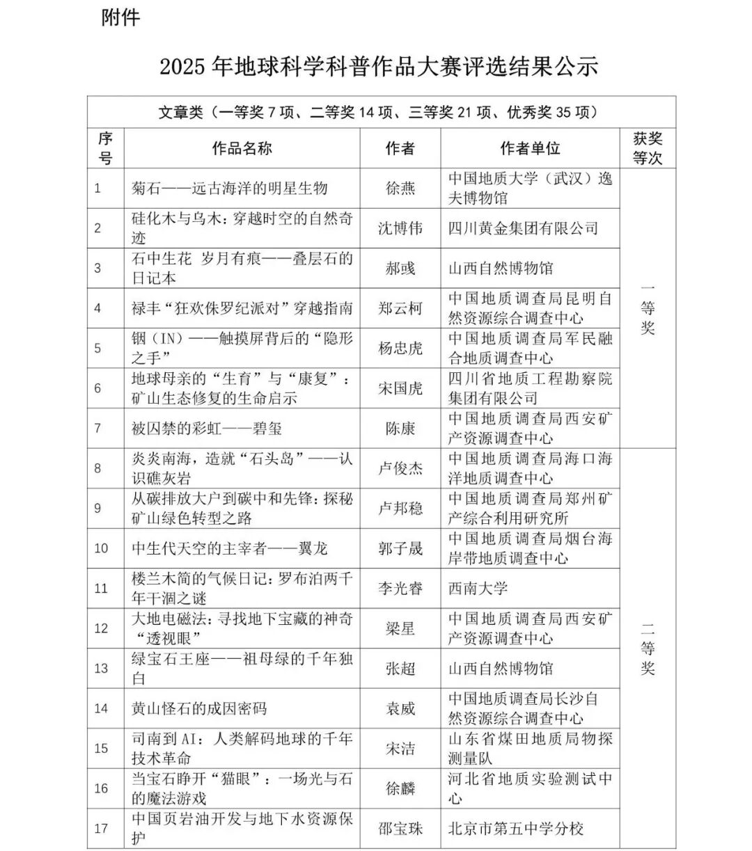 近日,2025年地球科学科普作品大赛评选工作已圆满结束。大赛由中国地质图书馆(中国地质调查局地学文献中心)、李四光地质科学奖基金会共同主办,中国地质学会地质科学普及工作委员会、中国自然资源报社、中国地质科学院矿产资源研究所、中国矿业报社、中国地质大学(北京)自然文化研究院联合协办,“学习强国”学习平台作为合作媒体。