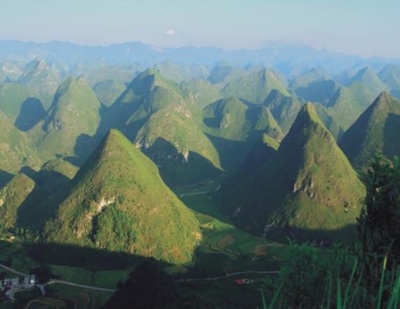 峰丛[peak cluster,cockpit karst]:以锥状石峰为主,基部彼此相连的连片山地景观。石峰之间常形成“U”形的马鞍地形,下部的则为多边形封闭洼地,正负地形之间高差自数十米至数百米。