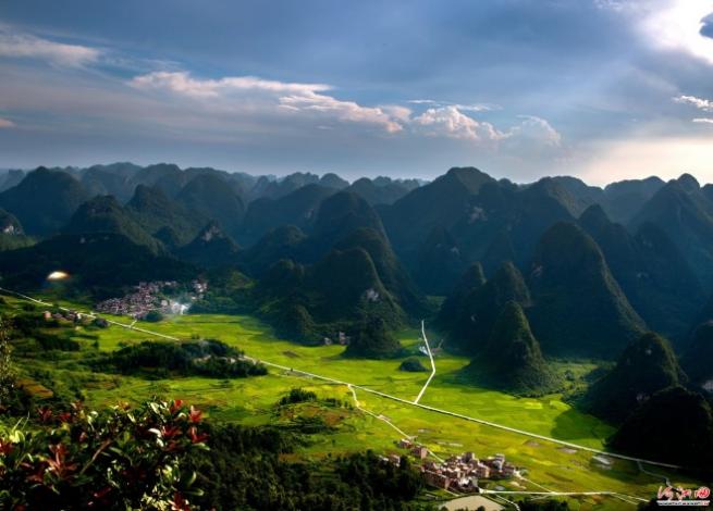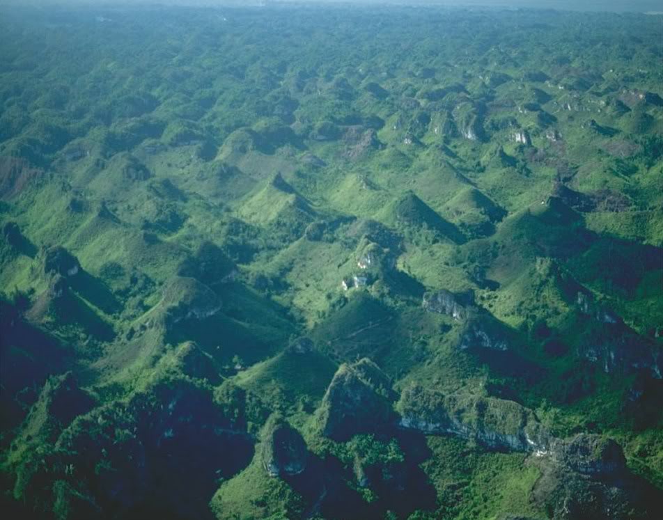 以锥状石峰为主,基部彼此相连的连片山地景观,石峰之间常形成“U”形的马鞍地形,下部的则为多边形封闭洼地,正负地形之间高差自数十米至数百米。