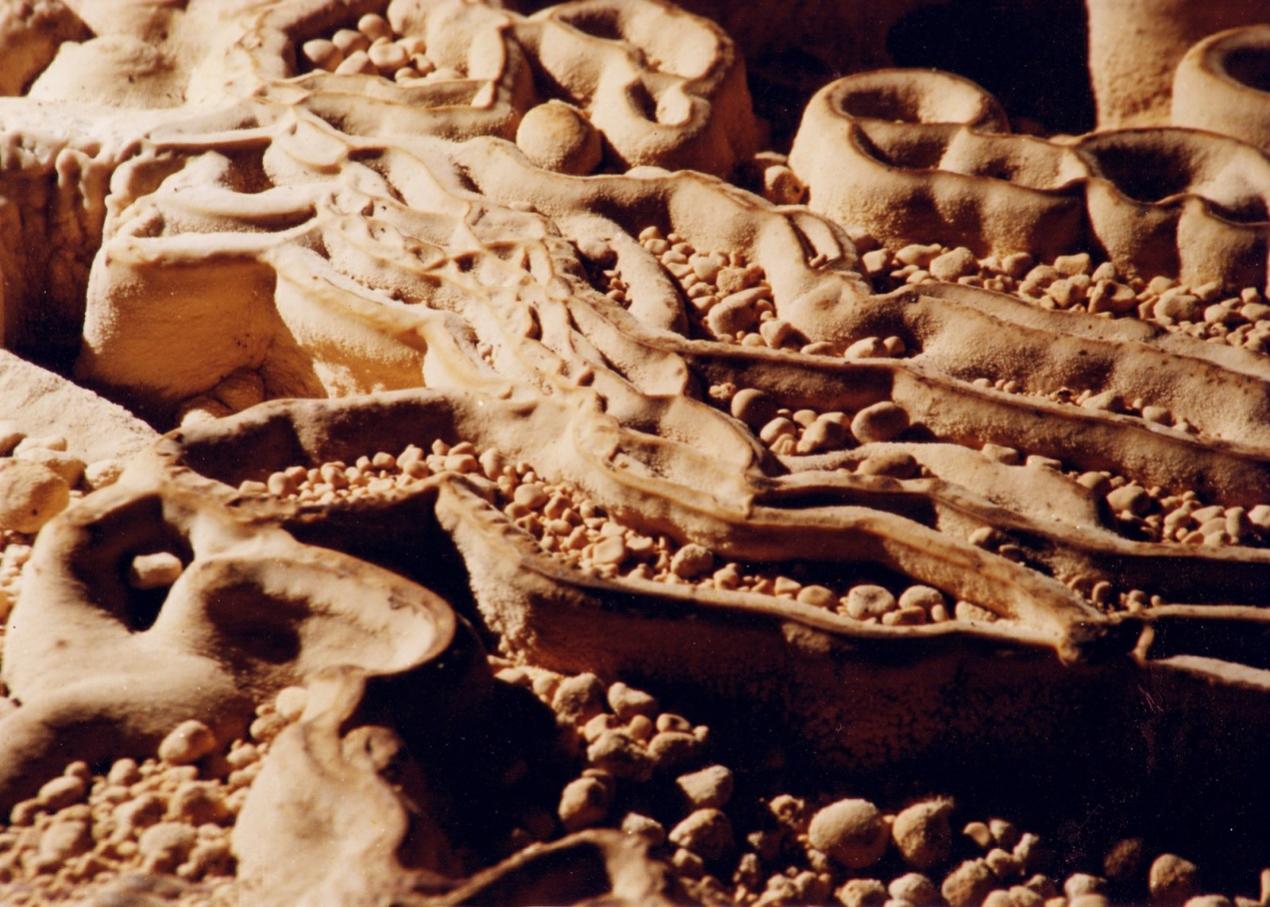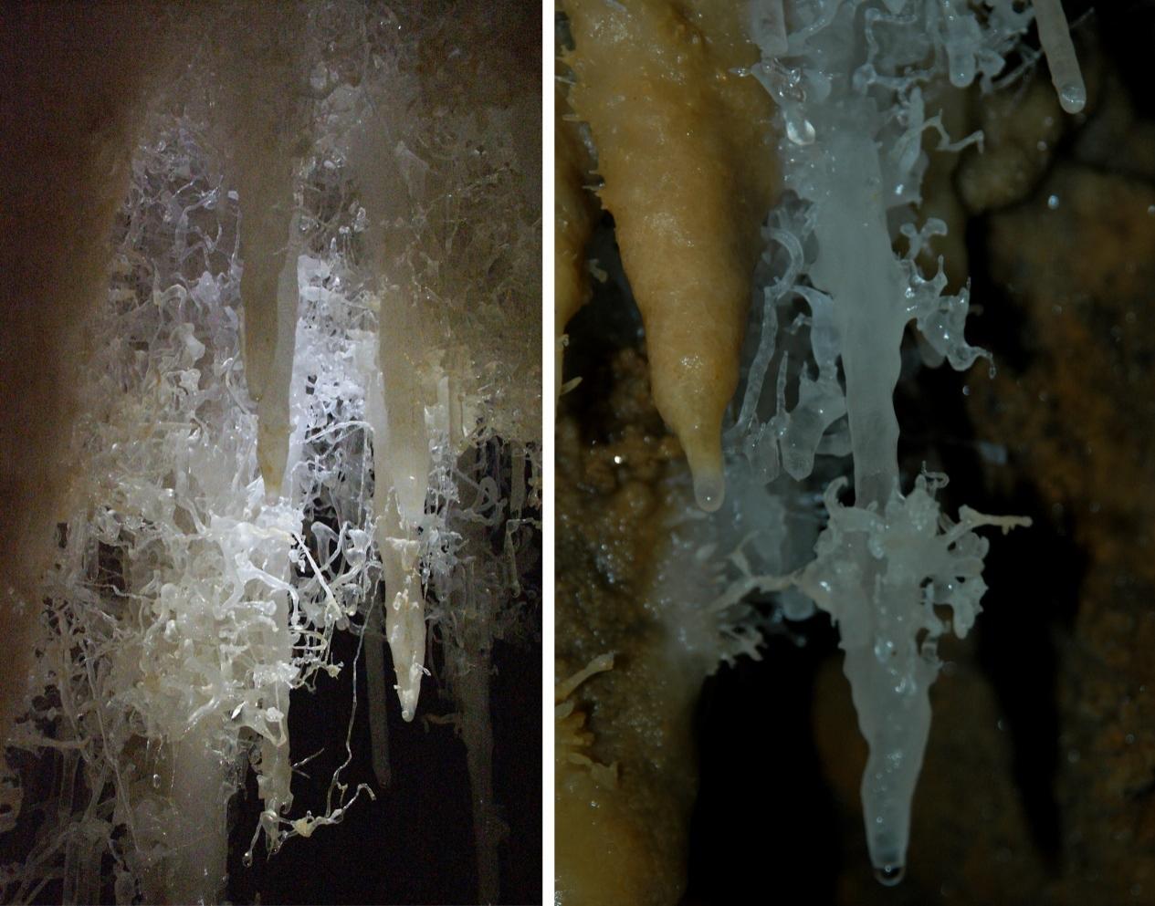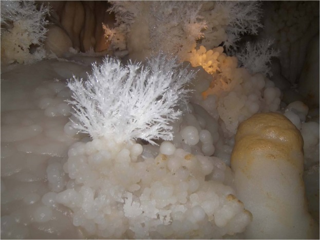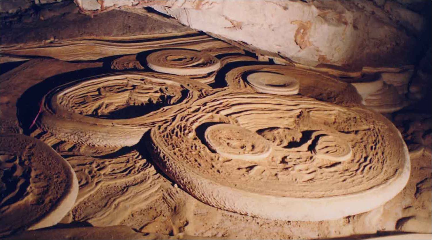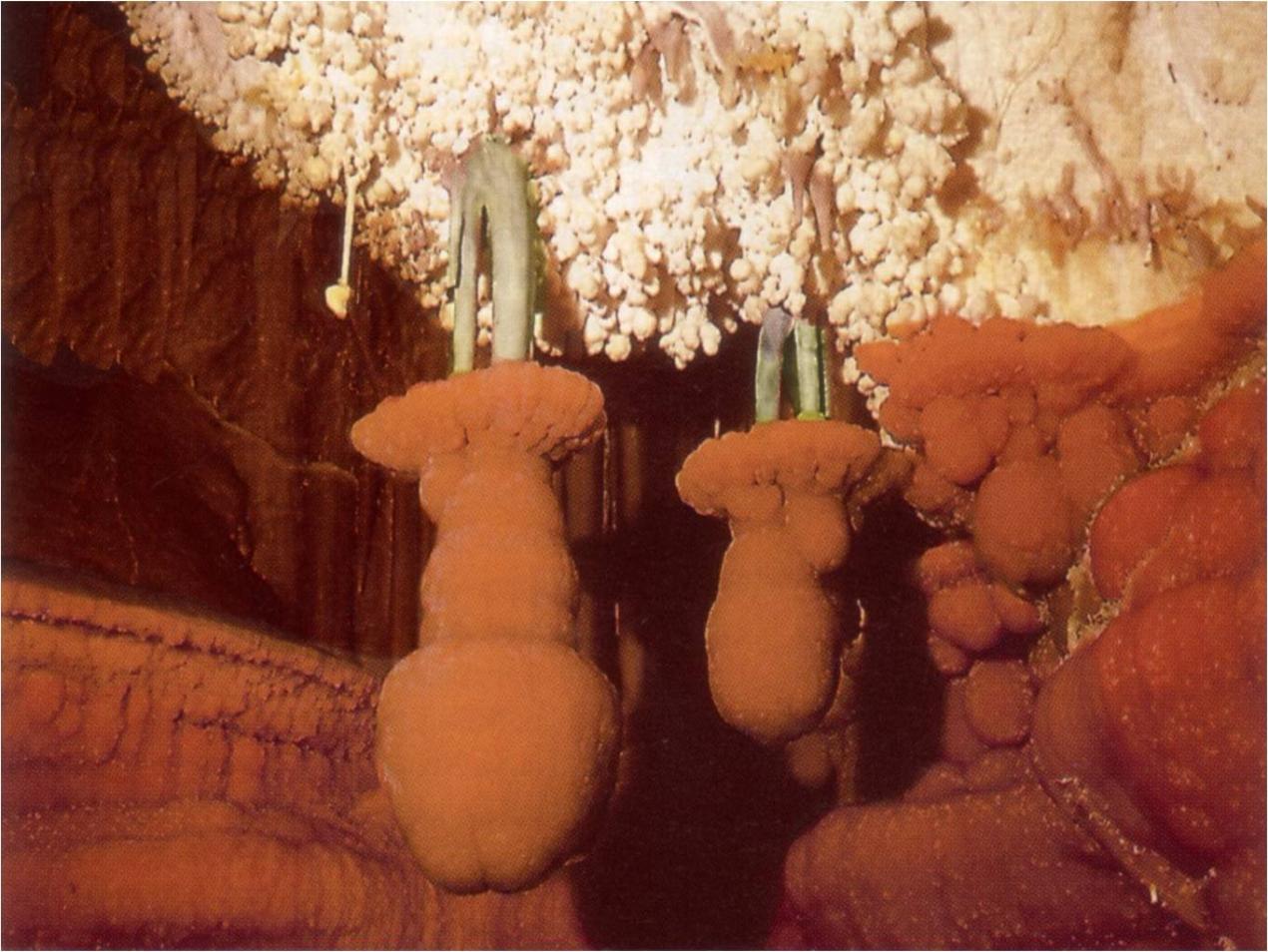 非重力水沉积是指主要在毛细水及更微量的水分(如薄膜水)活动条件下形成的钟乳石,沉积形态有卷曲石、方解石晶花、文石花、石膏花等形态。