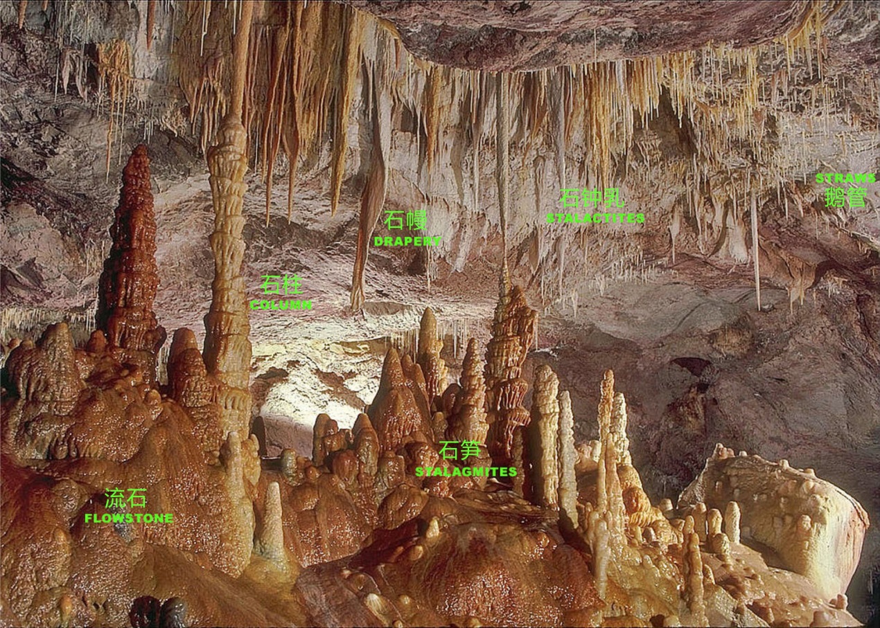 次生化学沉积 [speleothems]:洞穴中由水的作用造成的各种次生矿物沉积物的通称,包括重力水沉积、非重力水沉积、协同沉积、叠置沉积和异因同形沉积等五大类。