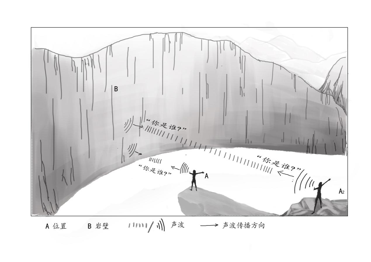(3)地震反射法探测原理:在野外面对成平面的垂直岩壁,大喊一声“你是谁?”,对方也会问你“你是谁?”,且你离岩壁越远,回声的时间间隔就越长。记录这个回声时间,由于声音速度已知,就可计算人与岩壁的距离。