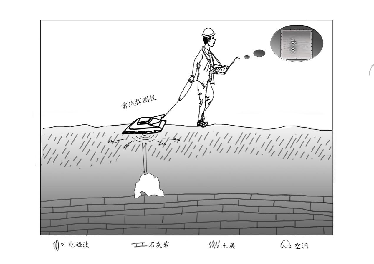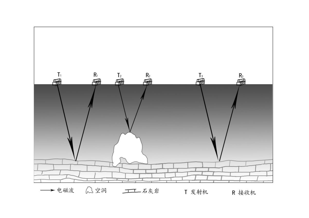 (4)地质雷达探测原理:与地震反射法类似,当向地下发射电磁波而非震波时,电磁波遇到空洞(电性不均匀体)时将发生反射或散射,同样用仪器接收反射波的返回时间、返回强度,就可判定空洞的几何特征和属性。