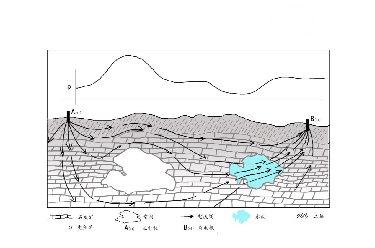 (1)电法原理:在地面两点间供入电流,电流将在地下流动,当遇到空洞(绝缘体)时,被阻碍而绕开;而遇到水洞(良导体)时,被吸引而汇聚。我们利用这个原理,测量电流被阻碍或被吸引的程度(电阻率),来识别地下空洞、水洞的存在。