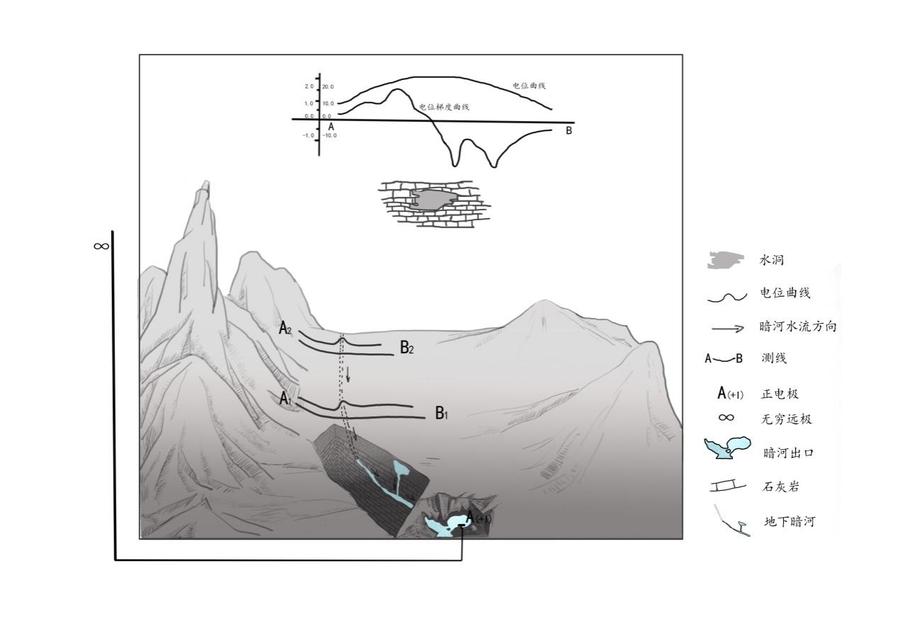 (2)充电法探测原理:利用电流容易在有水洞穴(良导体)中流动这一特性,在暗河出口处供入电流,电流将会随地下暗河移动,在位于地下暗河上方会检测到电位的极大值,将许多测线上的电位极大值位置连接在一起,就可以确定地下暗河的位置和流向。