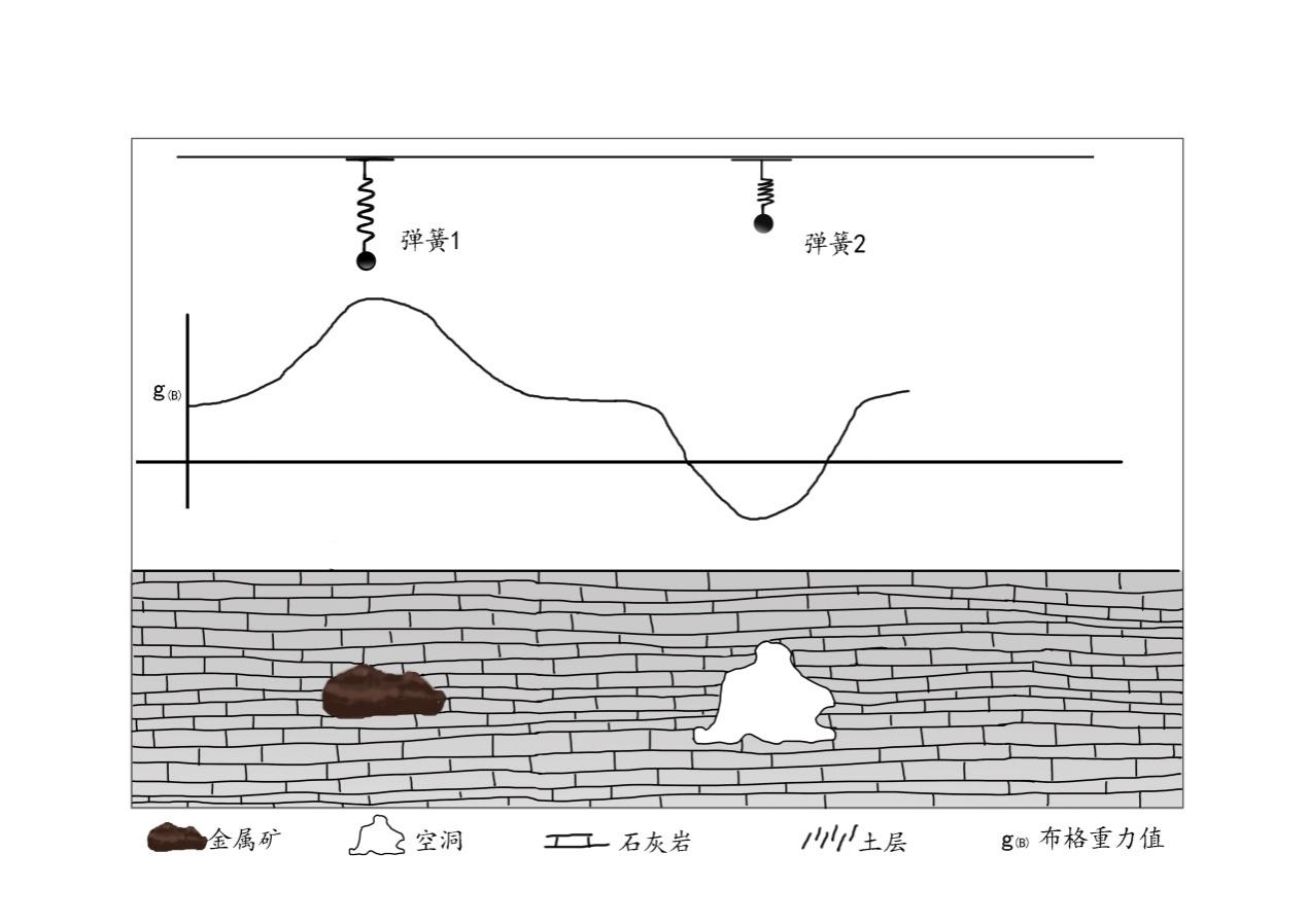 (5)重力法探测原理;地球上的各物体,均遵循牛顿万有引力定律,密度大的物体间引力较大,因此规模相差不大的铁块与空洞相比,由于铁块密度远大于空洞,因而相对引力也较大,仪器弹簧拉伸。我们利用此原理,来识别地下具有密度差异的目的体。