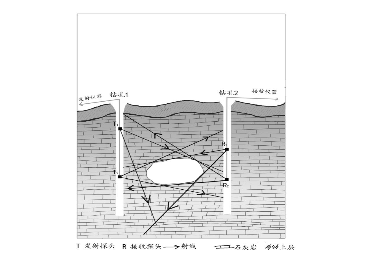 (6)透视法探测原理:透视法根据不同物理原理可分为电磁波透视、地震波透视和电阻率透视。在一个钻孔中放置仪器发射信号,而在另一钻孔中放置仪器接收信号,当电磁波、地震波或电流遇到空洞时会被阻碍而绕开,在接收端由于信号被空洞阻挡而形成“阴影”,利用多角度射线,可勾绘空洞的空间位置和特征。