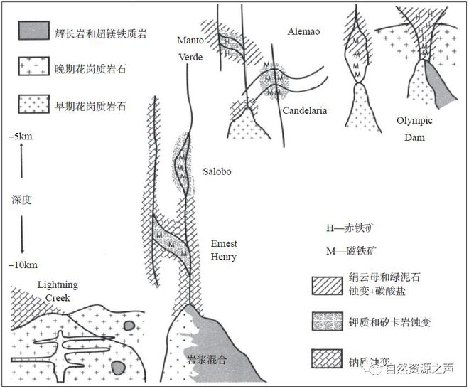 Hitzman et al.,(1992)系统地总结了澳大利亚奥林匹克坝矿床、加拿大Wernecke Ernecke 山和 Great Bear 矿区、瑞典基鲁纳铁矿、美国密苏里东南铁矿区和我国白云鄂博矿床的地质特征,将它们归纳为一种新的矿床类型——铁氧化物型铜- 金矿床(Iron oxide copper-gold deposits,简称IOCG 矿床)。这类矿床一般形成于古元古代至中元古代的张性环境中。大型矿床含矿石量大于108 t,铜品位0.8% ~ 1.6%,金品位(0.25 ~ 0.8)×10-6。