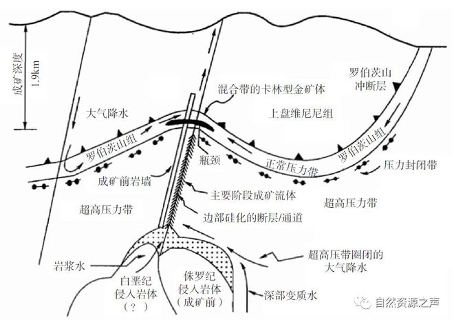 卡林型金矿床“综合成因模式图”(据Arehart,1996)