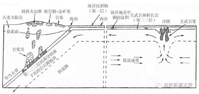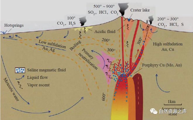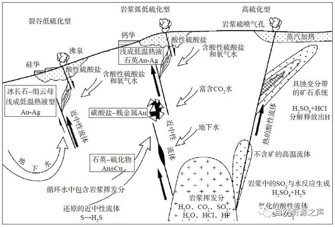 高硫化型和低硫化型浅成低温热液型矿床以及斑岩型铜金矿床成矿模式图