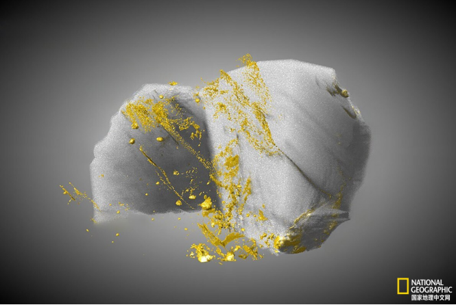 这幅假彩色X光成像三维重建图展现了石英中的优质黄金。|CHRIS VOISEY